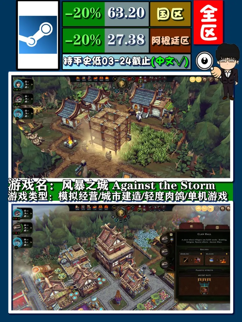 《風暴之城》,同樣是城,卻不可同論,作為一個較有深度的遊戲,老基德個人比較推薦,遊戲性相對比較耐玩,在基地建設上加入肉鴿元素,或許對新人有點不太友好,畢竟隨機性的加入勢必讓很多內容變得雲裡霧裡,同樣運氣成分的不可控性讓這款遊戲有點看臉,不過這也是快速熟悉遊戲內容的一種方式,如果你對不斷重複開局不排斥,老基德推薦你入手,價位方面去年冬促剛入新史低,有所保障