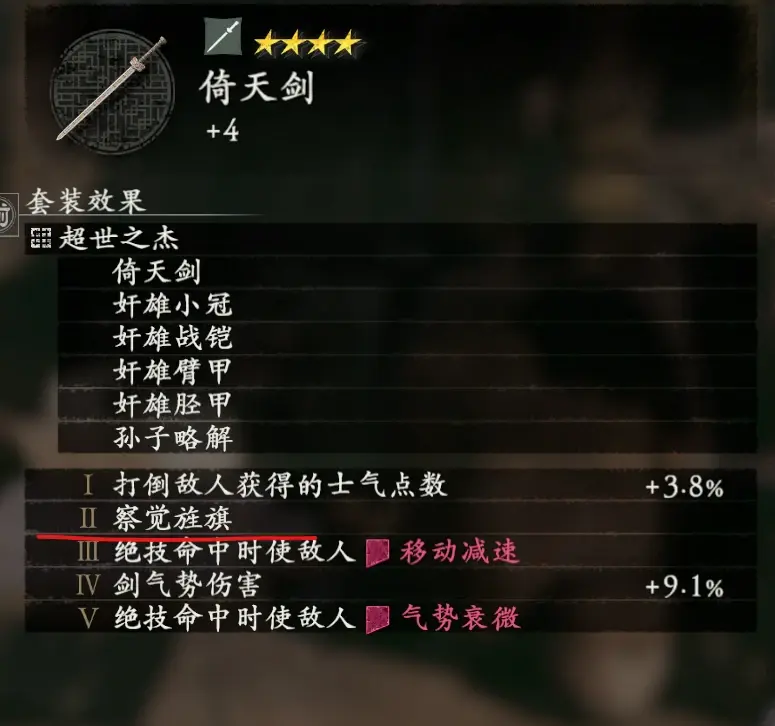 輔助詞條:這邊就講一講套裝效果了,比如我用的曹操套,副武器掛的倚天劍,曹操套有一個察覺旗子的技能,所以如果像我目前處於開荒階段需要這個技能,而我套裝有了,所以裝備詞條不需要帶;因此,我們帶獲得氣勢,不管你是平a還是化解,都是需要的。最後,如果你不是曹操套,又處於開荒期,那麼還是需要察覺旗子這個技能。如下圖所示