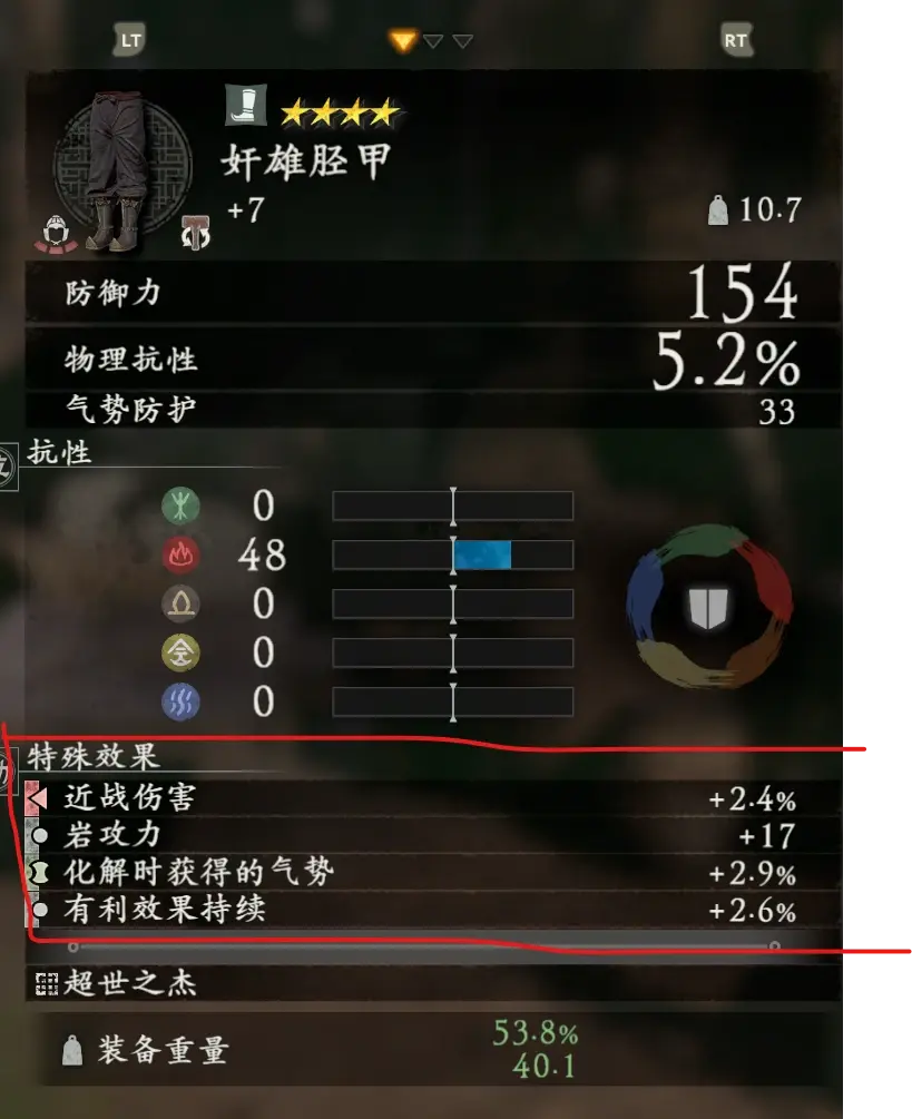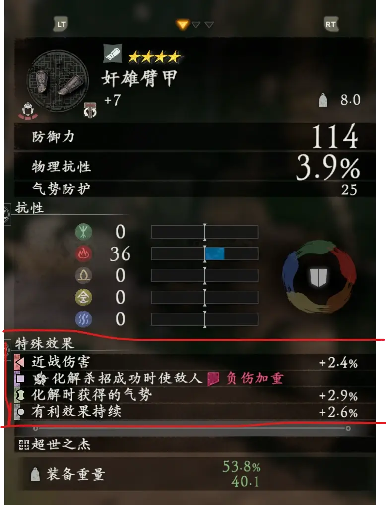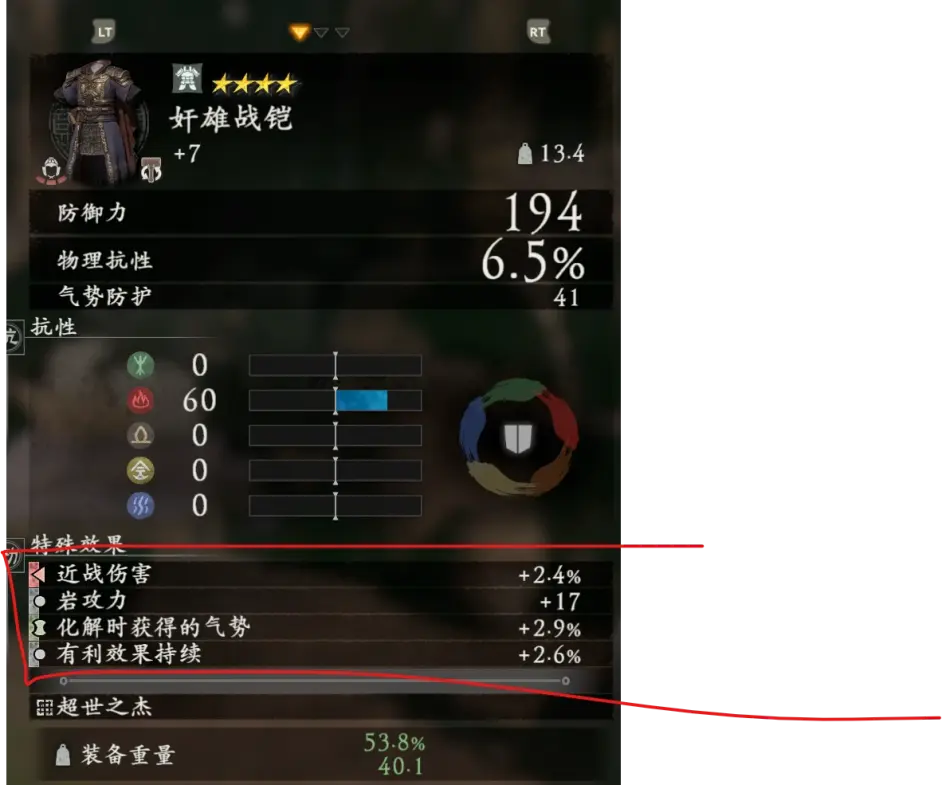 頭跟手腕類裝備可以帶一個buff詞條,這邊注意,同一個buff是不會疊加的,除非你是那種數值buff,就比如恢復加多少體力這種,你帶多少都OK。所以,我們需要先看一下我們的套裝屬性(如上圖所示),我們就不需要再加這兩種debuff。