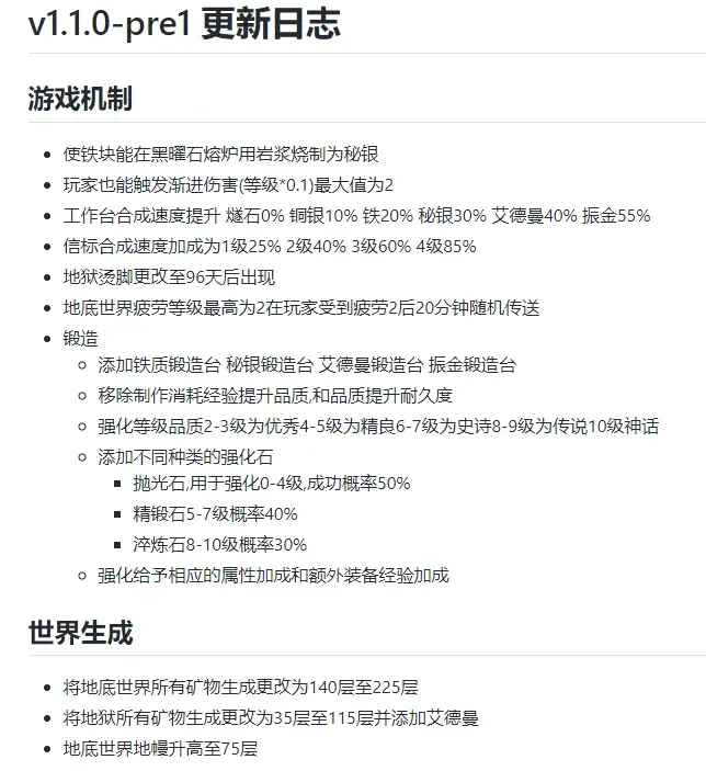 1:遊戲機制方面我察覺到了不對勁,大家仔細看第三條。振金V1.1.0-Pre1的更新日誌中,振金工作臺的合成速度提升到了55%,大家看我之前玩極難版的時候,振金工作臺就是地精工作臺,無論是什麼東西,都是一秒製作【MITE極難版】振金時代一秒製作祕銀砧,遊戲已經結束了 極難版生存09