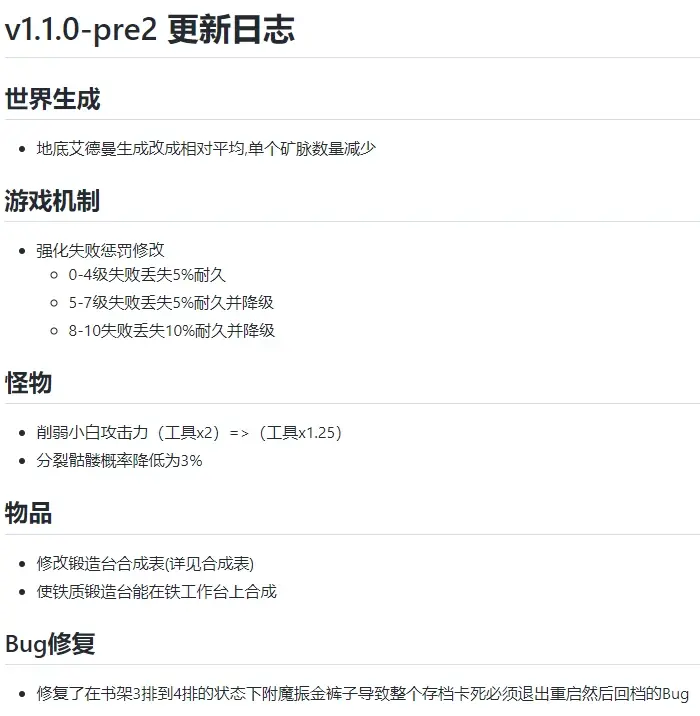 3:地下世界就更別說了,地幔提升到75層倒是真的,但是Wensc把地下世界改成了什麼樣子就別說了。我開DEV在V1.1.0-Pre1的地下世界跑路時,我草,那祕銀艾德曼簡直遍地都是,反而金銀銅鐵倒幾乎看不見(PS:在V1.1.0版本的後面,地下世界艾德曼降低至130層左右,導致在前面版本遍地都是艾德曼的場景一去不復返,但是那層的艾德曼還是很多的。另外V1.1.0的地下世界鑽石提升了100倍儲藏量,也就是XiaoYu233把鑽石礦生成權重從5改到了500)