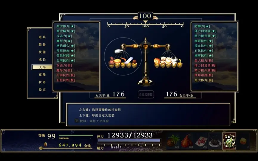2.天平兩邊要儘量平,上面顯示的數字是屬性生效的百分比,如果是0的話你這天平上的屬性就不生效。