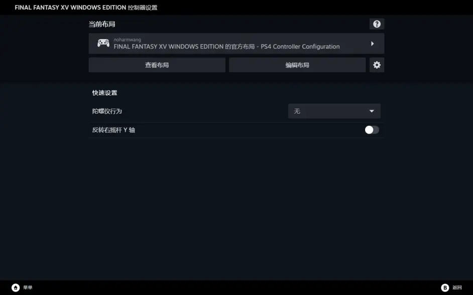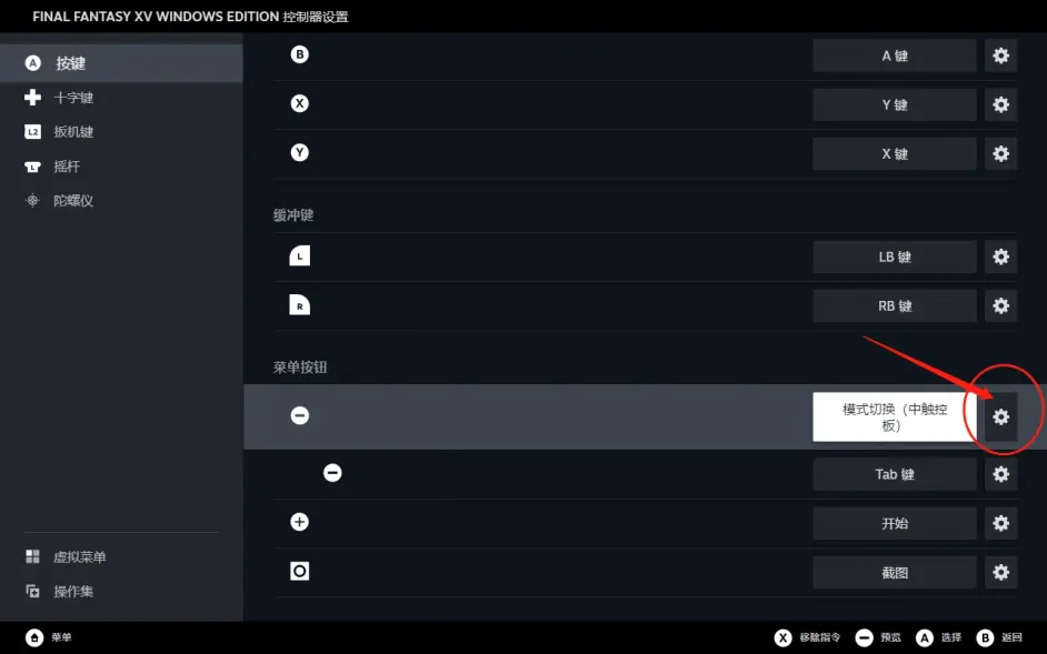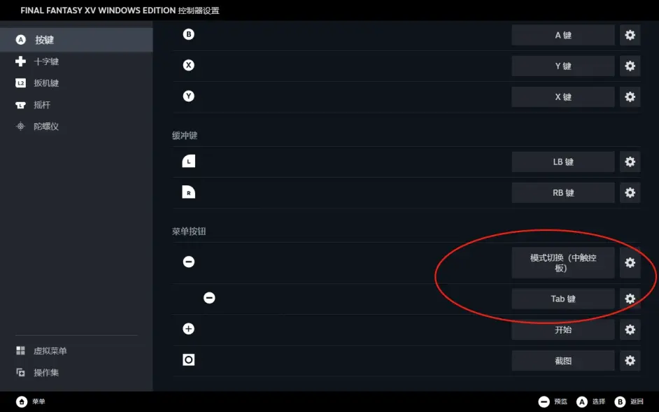 Steam版的最終幻想15針對ns pro手柄沒有做好鍵位對映,解決辦法之一是在無需第三方軟體的情況下,給ns pro手柄的減號鍵手動新增鍵盤“Tab”鍵(鍵鼠操作中“Tab”鍵負責調出選單)的對映,以調出遊戲內的選單。
