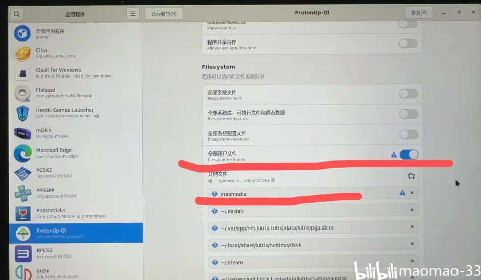 2. 開啟下載好的flatseal 選擇 pronton-qt 找到全部使用者檔案 選項 點啟用 然後在下面新增一項路徑/run/media(如果已經存在就不需要輸入了)
