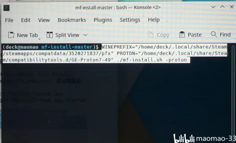 WINEPREFIX="/home/deck/.local/share/Steam/steamapps/compatdata/3520271837/pfx" PROTON="/home/deck/.local/share/Steam/compatibilitytools.d/GE-Proton7-49" ./mf-install.sh -proton