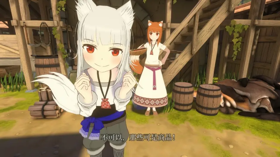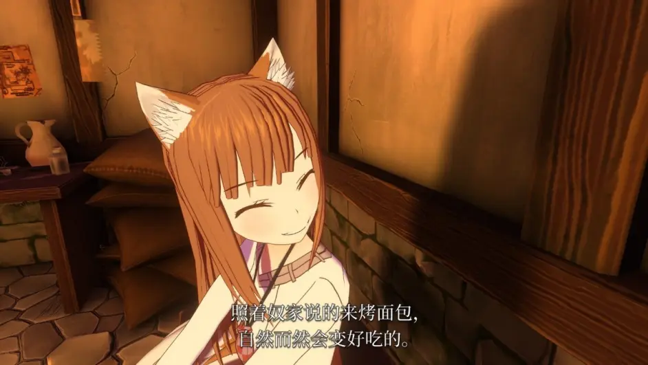 而《狼與香辛料VR》在性質上則更像是動畫的番外篇,總計3話時長加起來約半小時左右,敘述的是羅倫斯和赫蘿在旅途當中停留在一間廢棄的水車房小憩時的插曲故事,將這個段落放入原作劇情中的任何一個部分都毫無違和感。圍繞著買不買梳尾巴用的新梳子和毛刷、葡萄乾是直接吃還是留到做麵包時放入這樣的日常小事展開論斷,羅倫斯和赫蘿二人為大家奉上一臺相當精彩的對角戲。螢幕前的玩家輕易就被赫蘿老婆的魅力所俘獲、不自覺露出姨母笑,以發糖粉絲向作品的要求來看,本作真的是相當成功了。