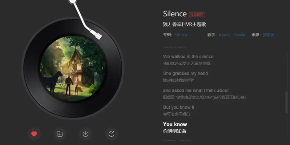 《狼與香辛料VR》的主題曲可謂是畫龍點睛之筆。由知名VOCALOID職人、詞曲作者n-buna操刀,Furukawa Sarah所演唱的《Silence》真的是非常非常驚豔。Furukawa Sarah小姐姐雖然是日裔,但從小在美國東海岸的紐約長大的她,受父親影響而聽了大量70與80年代的歌曲,對西方音樂潮流非常熟悉,因此駕馭全英文的歌詞毫無壓力,對這種有點北歐空靈風格的歌曲也是遊刃有餘。