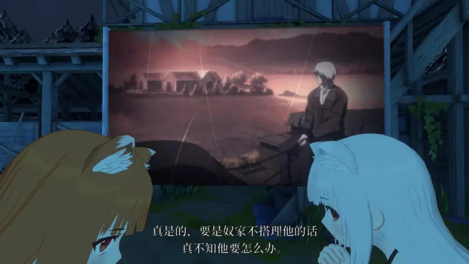 在主標題下有一個“欣賞動畫”的選項,取代了前作中通關後可以選擇的“親近”選項的位置。雖然這使得玩家在《狼與香辛料VR2》中不能像前作那樣自由的和赫蘿互動,但我個人會更喜歡現在的這種模式——點進去後您會發現這其實是一個巧妙的劇情回顧,通過一家三口觀看露天電影的形式來讓經典劇情再度上映。