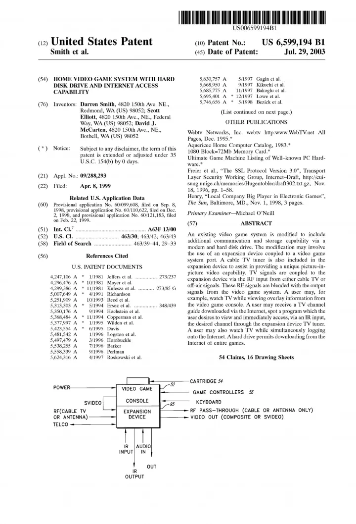 專利主要內容:關於一種具有硬碟驅動器和網際網路接入能力的家庭視訊遊戲系統。這項技術可以讓玩家通過調變解調器撥號網路服務提供商,並通過服務提供商的網路訪問全球資訊網、傳送電子郵件、玩遊戲和/或下載可執行程式、視訊和音訊資料到系統的硬碟驅動器。這項技術還可以讓玩家在觀看電視的同時檢視來自視訊遊戲機的疊加資訊,或者在觀看電視的同時登入網際網路。
