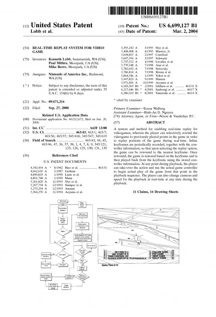 專利主要內容:關於一種實時回放系統,用於在視訊遊戲中記錄和重現玩家的操作。它可以讓玩家在遊戲中暫停、回退、快進或慢放自己的遊戲過程,也可以讓玩家在回放模式下改變視角或控制其他角色。