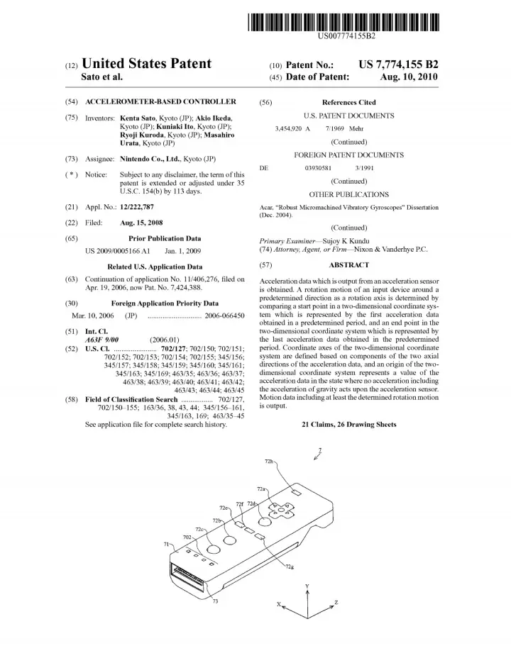 專利主要內容:關於一種基於加速度計的控制器。這種控制器可以檢測使用者對其施加的加速度,並根據加速度資料來確定控制器圍繞一個預定方向作為旋轉軸的旋轉運動。然後,控制器輸出包含至少確定的旋轉運動的運動資料,用於控制遊戲或其他應用程式。