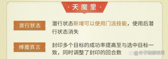 核心改動內容:天魔裡在“潛行”狀態下可以使用門派技能,但使用技能後潛行狀態消失。