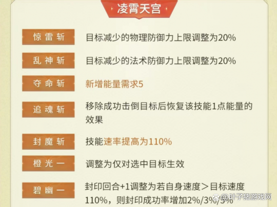 法系門派鬼谷大削、龍宮魔王小增強,法術傷害的五行屬性有較多調整,吸收寶石削弱,總體仍是魔王強勢鬼谷龍宮能玩的格局。