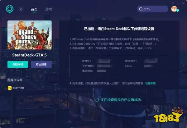 第五步:完成設定,如設定成功則自動進入加速頁面。加速完成後,steamdeckgta5打不開/進不去/卡載入介面問題的就解決了。