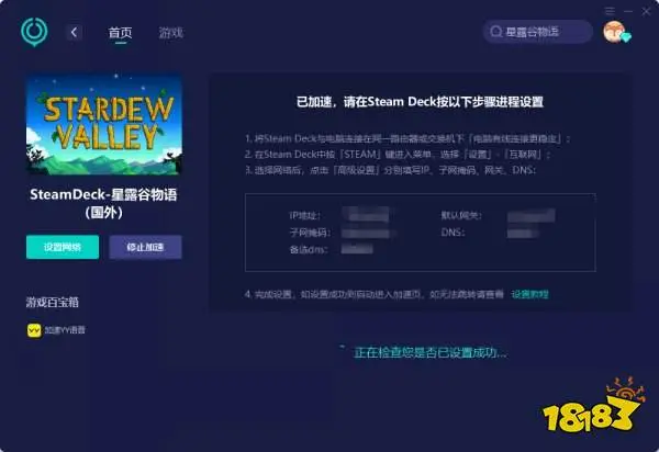 第四步:按照UU加速器所提供的教程設定steamdeck的網路,設定完成後steamdeck就可以享受到加速效果了,steamdeck星露穀物語聯機掉線/閃退/網路不穩定的問題就解決了。