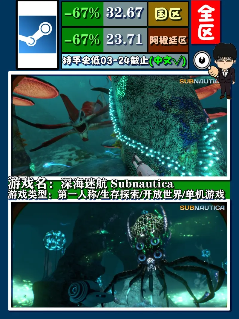 《深海迷航》,作為老基德打折遊戲節目中的常客,然而依舊會選擇推薦,由於此次該作和新作《冰點之下》在今年1月底進入了新史低,所以價位方面對於等等黨們是個不錯的選擇,而畫面,玩法這些方面想必也不用老基德多嘮叨了,喜歡生存探索,喜歡海底風景的玩家們可以無腦直入,或許唯一的缺陷就是聯機,初代之前有過聯機模組,但極不穩定,我們還是等官方自己出或者新作期待聯機吧