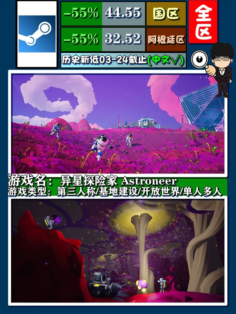 《異星探險家》,玩法簡單好上手,單機聯機都能有,既能享受探索外星上的各種奇妙體驗,又能和朋友們一同聯機,想必沒入手的玩家肯定會考慮一下吧,更何況此次價位進入了難得的新史低,即便嚷著沒朋友,至少也能獨自遊,值得推薦!