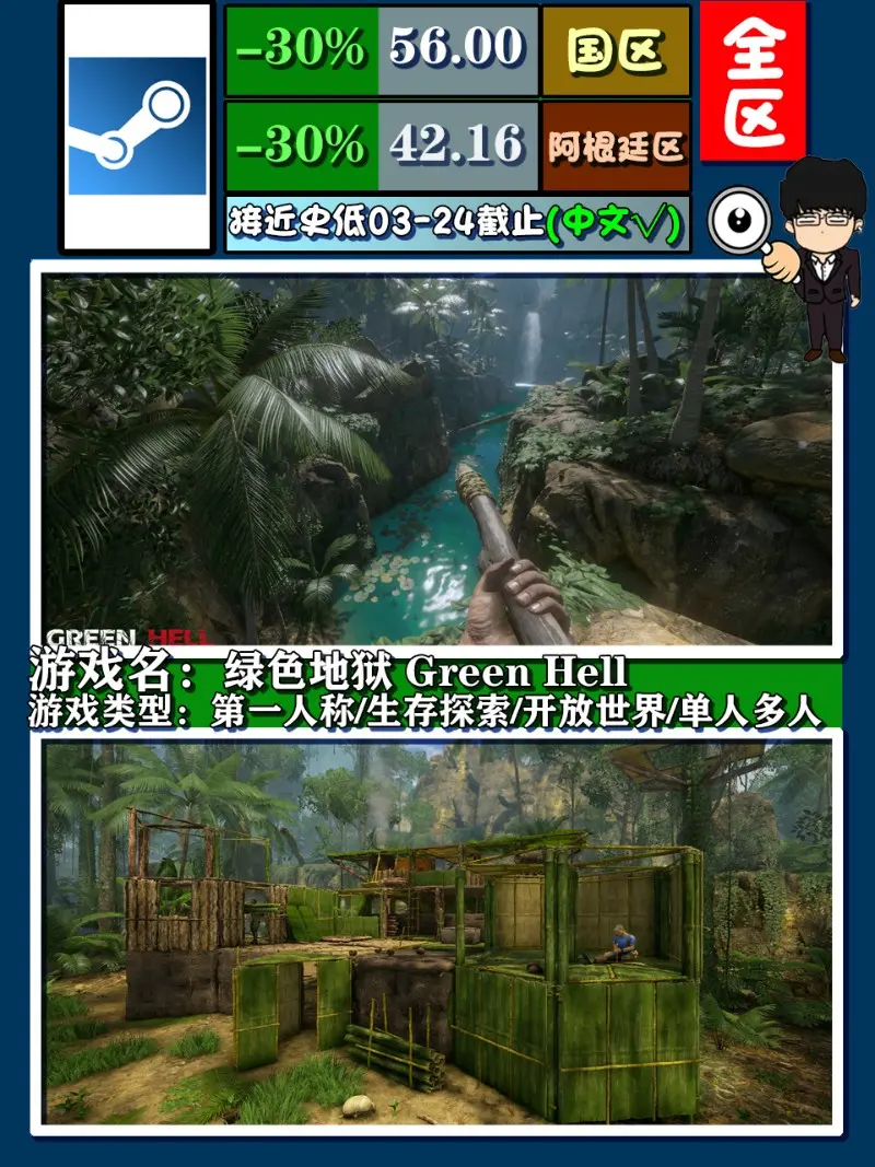 《綠色地獄》,一款熱帶雨林為主要場景的生存遊戲,有建造,有水下,有劇情,且支援手柄,全程下來差不多17小時左右可以通關,同樣也支援最多4人聯機,老基德個人沒有嘗試聯機,但目測評論區似乎這方面吐槽的玩家找不到,暫且作為一個穩定的參考,另外該遊戲官方依舊在持續更新,3月份釋出了最新更新路線圖,將會推出新的儲存和運輸工具,更具有挑戰的部落衝突,還會加入新動物