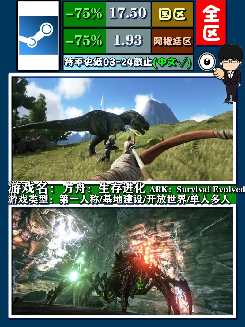 《方舟:生存進化》,這款想必大部分喜歡生存探索遊戲的玩家都有接觸過,此次常規的持平史低價位依舊值得推薦,更何況新作即將來臨,據說戰鬥系統加入了類魂玩法,這下可把難度提高了不是一點點,手殘黨們不知會有多少人被迫嘗試高難度,要不買個初代,我們先準備一下除戰鬥外的其他玩法內容