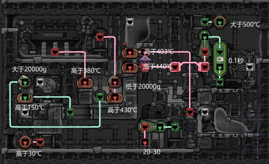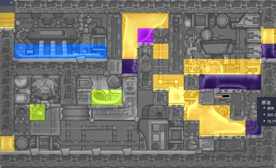 液體概覽,凝膠部分可以使用原油,右邊蒸氣室得熔融鈾可以在裡面建造鈾高壓導線綠色液體是熔融鈾,此液體熔點低,沸點高,比熱低。就是比較貴。