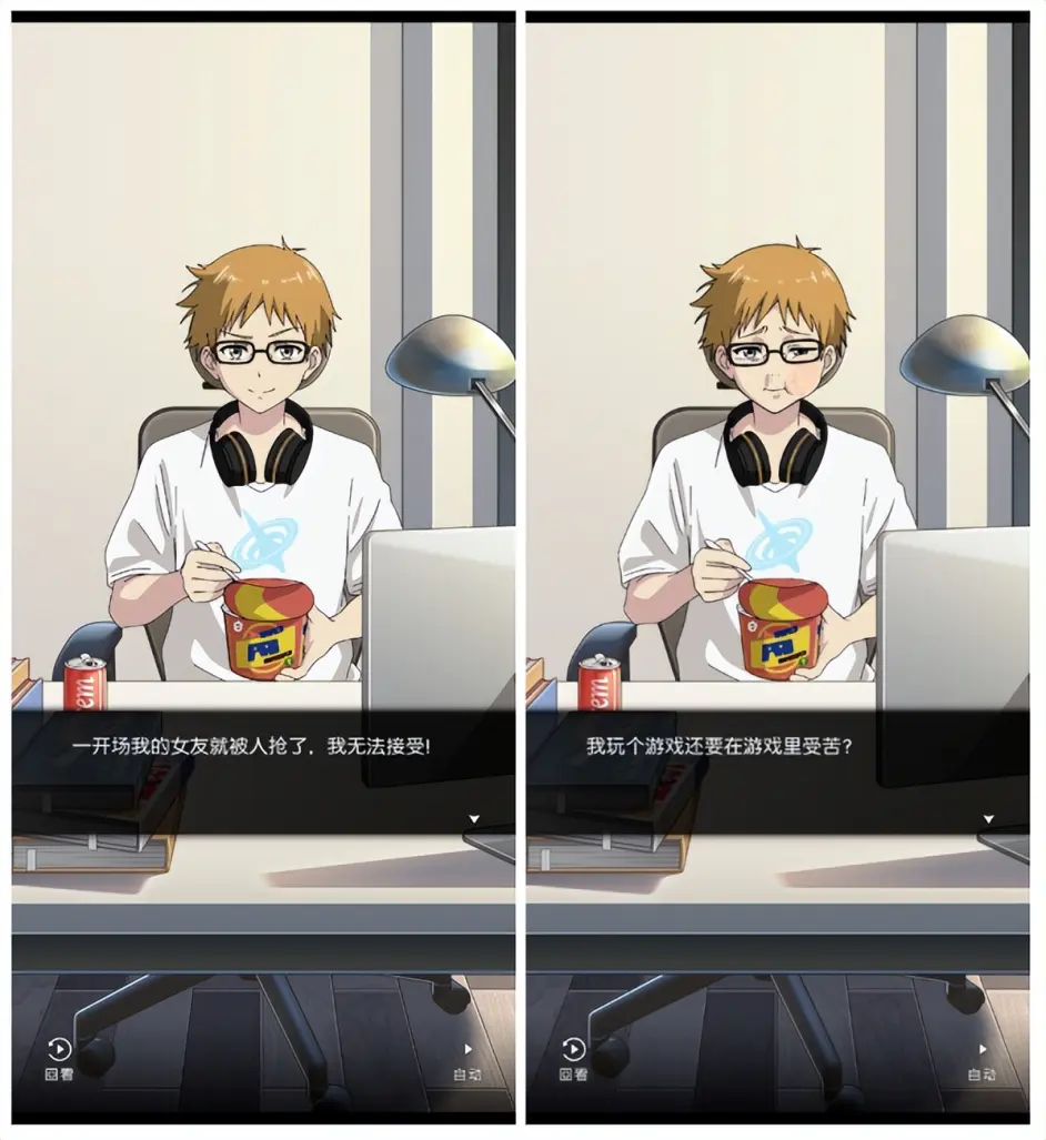 然而此類劇情展開在網文中已司空見慣,但當它與戀愛AVG遊戲掛鉤,或許將放大“戴綠帽”的主觀體驗。與旁觀視角閱讀小說、漫畫不同,伴隨點選互動閱讀,玩家會有更沉浸的體驗。就如一位玩家所說:“漫畫可以看,遊戲代入感太強,不敢多看。”