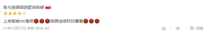 這裡的NTR指,“自己的物件被別人強佔”,源於日語的羅馬音縮寫。在小眾領域,如日式黃油遊戲中,它一般會被明文標註。據一位二遊玩家表述,“一般較為忌諱,畢竟誰也不想在《Clannad》中突然被NTR是吧“。一位資深玩家向茶館說,在這類遊戲體驗中,強調的是"遊戲角色的心理變化“,那種不得已、又被深淵吸引的一意孤行與矛盾的過程。
