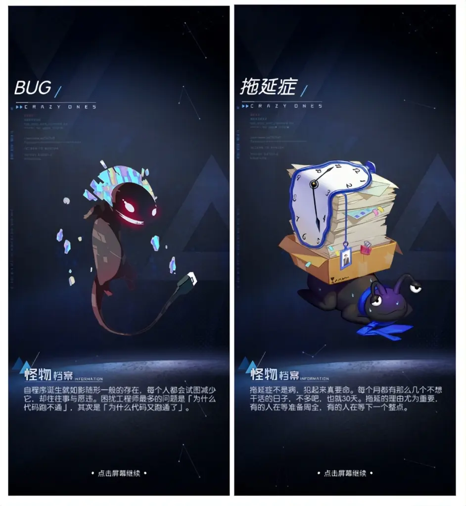 玩法上,遊戲在傳統AVG之外搭載輕度的策略卡牌CCG玩法,前期整體還算輕鬆快樂。玩家通過“回憶”抽取卡牌,獲得攻擊、治療、狀態涵蓋三種屬性的構築卡堆,開局擇卡出陣,每個行動回合隨機三張卡牌供玩家出擊。boss取材自現實,比如拖延症、bug、木馬等社會“慢性病毒”以怪物檔案呈現,暴打小怪同時,又帶有“蟹蟹,有被Q到”的苦笑感。