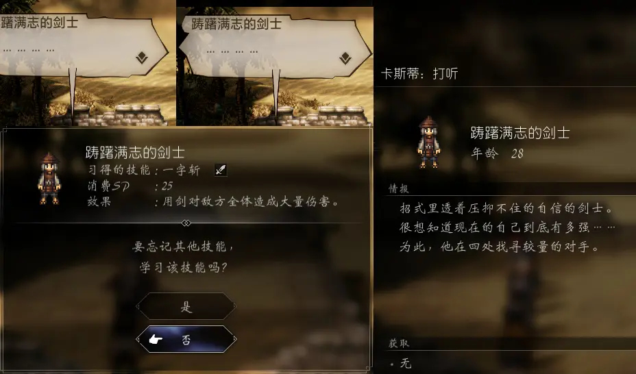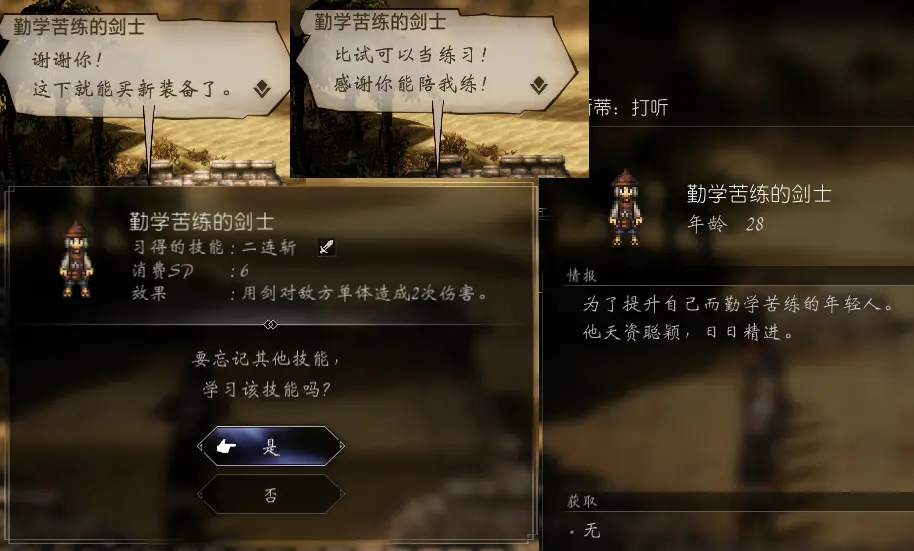 這招槍法,正是前作劍士職業的“一番槍”,威力也屬於“一刀兩斷”這一檔,優秀的地方在於附帶額外特效,那就是下回合先制攻擊的效果。