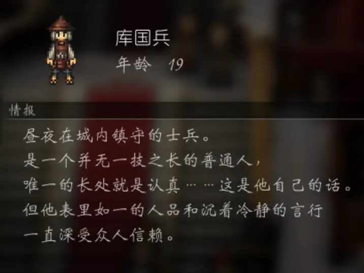 年輕的庫國士兵,並沒有什麼長處,只有認真和表裡如一的特質,身受大家的信賴。