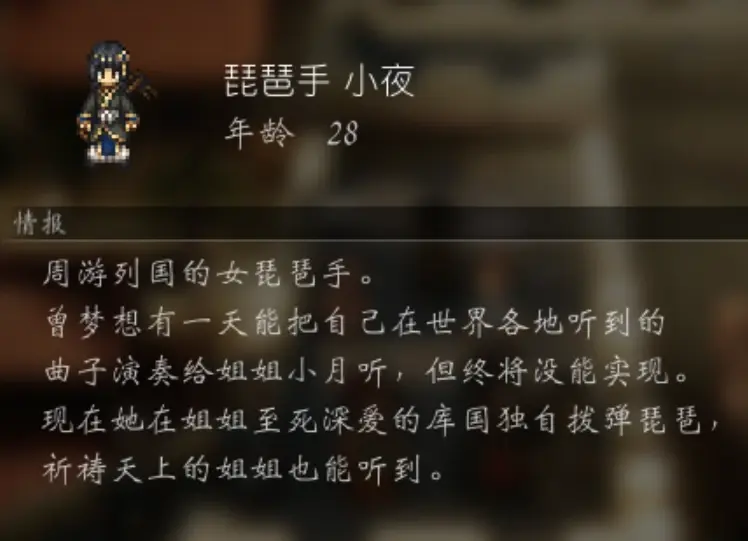 擁有著獨特技能的琵琶手小夜,是光的侍女,小月的妹妹。在解鎖光與愛格妮婭的雙人劇情後,她將出現在庫國外圍的城牆。
