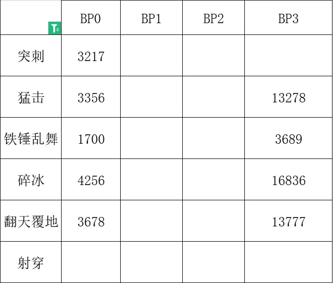 傷害實測資料如下。其中,突刺、射穿,猛擊,斬擊為同一威力,不同武器的技能。