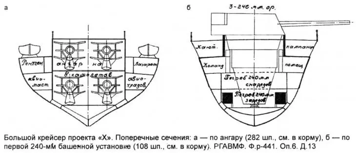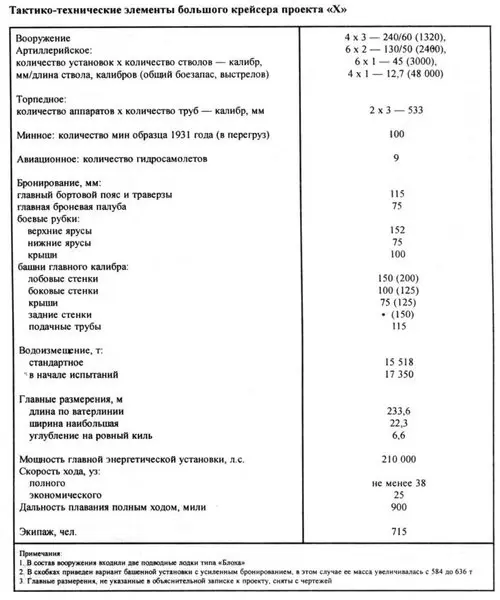 “X”專案的設計標準排水量至少為15,518噸,滿載排水量約為17,350噸。就船體尺寸而言,它將是233.6米長,22.3米寬和6.6米吃水。配備 4 x 3 - 240 毫米/60 門主炮;輔以6 x 2 - 130毫米/50 B-2LM雙炮甲板炮塔,2 x 3 - 533毫米三重魚雷發射管,6 x 1 - 45毫米/ 46 21-K AA加農炮和4 x 1 - 12.7x108毫米DShK重機槍。