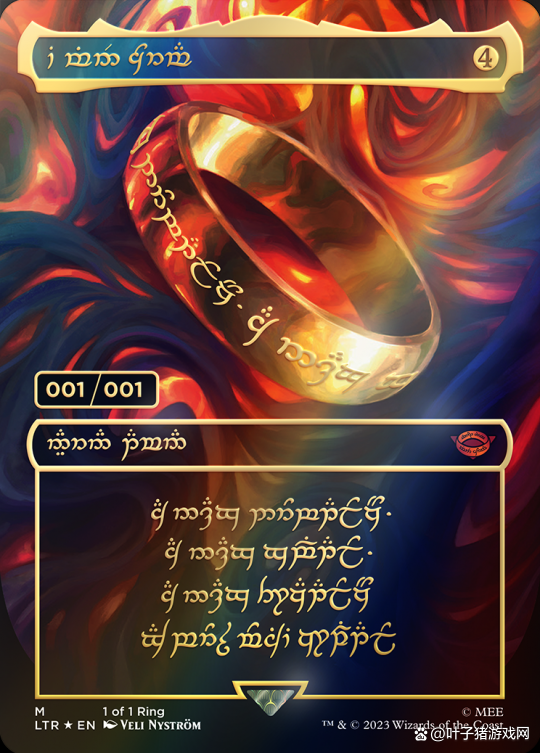 但最有價值,同時也是最被重視的卡牌,還得是作為整個《指環王》系列引子的“至尊魔戒”。跟原著小說一樣,萬智牌中的“至尊魔戒”擁有著獨一無二的崇高地位。官方專門為其製作了張全球唯一的特別款,以彰顯它的珍貴程度。