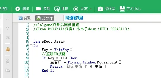 //Galgame雙開後同步推進 //From bilibili作者:木木子desu(UID:32943113) Dim sRect,Array Do Key = WaitKey() //監聽F8按鍵 If Key = 119 Then 主視窗 = Plugin.Window.MousePoint() MsgBox "繫結主視窗" & 主視窗 End If //監聽F10按鍵 If Key = 121 Then 同步視窗 = Plugin.Window.MousePoint() MsgBox "繫結同步視窗" & 同步視窗 //獲取同步視窗的中心位置 sRect = Plugin.Window.GetWindowRect(同步視窗) TracePrint sRect Array = Split(sRect, "|") x = (Cint(Array(0)) + Cint(Array(2)))/2 y = (Cint(Array(1)) + Cint(Array(3))) / 2 //我就不另設兩個視窗都繫結好的判定了,按F8、F10順序繫結好視窗後直接進入下一步(注意繫結成功有彈窗提示) Exit Do End If Loop Do //檢測回車鍵(13)或下方向鍵(40) Key = WaitKey() If Key = 13 or Key = 40 Then //移動到同步視窗中間,滾輪向下滾1 Plugin.Window.Active 同步視窗 MoveTo x, y MouseWheel - 1 //測試後感覺同步視窗用滾輪是最穩定的 Delay 100 //100ms,連續點選間隔不能小於這個值,可修改,但設得太短容易出問題 //回到主視窗 Plugin.Window.Active 主視窗 End If Loop //當然理論上來說也可以檢測你的滑鼠,但是用左鍵容易遇到麻煩,滾輪不夠靈敏,總之不推薦 //左鍵是32769~32771,滾輪向下是32781 /* Do click = WaitClick() TracePrint click If click = 32781 Then //移動到同步視窗中間,滾輪向下滾1 Plugin.Window.Active 同步視窗 MoveTo x, y MouseWheel -1 Delay 50 //回到主視窗 Plugin.Window.Active 主視窗 End If Loop */按鍵精靈直接從官網下載就好,雖然只有2014版本的,但功能已經很完備了。具體使用時點選左上角的新建,選擇空白指令碼