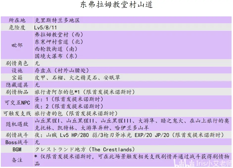 東弗拉姆教堂村山道向南、北兩個方向都會離開克里斯特蘭多地區,向東則是去往本地區2級村鎮的道路。因為是緊鄰新手村的地圖,當首發角色是提米諾斯時,會承載一個與首發角色繫結的特殊支線任務。