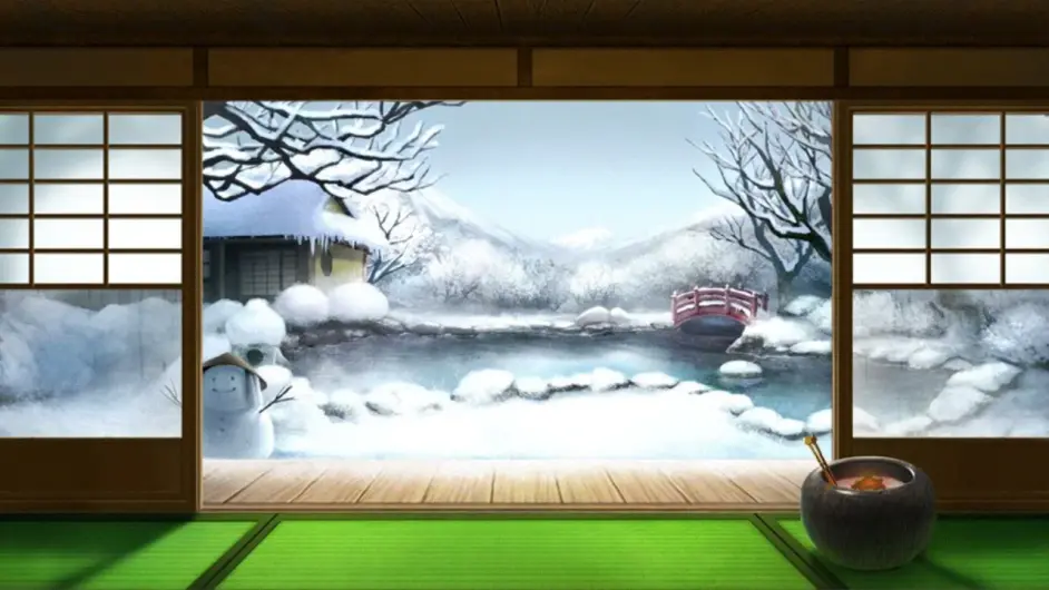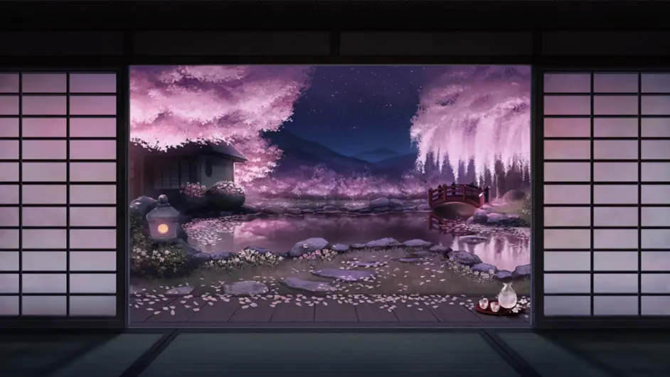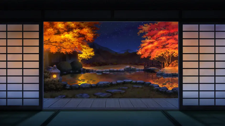 數不盡的繁星在空中閃耀,儘管今晚沒有月亮,卻明亮如滿月之夜。石燈籠裡的火光伴著秋蟲低低的鳴叫忽明忽暗,豔紅的楓葉毫不留情地將庭院染紅。