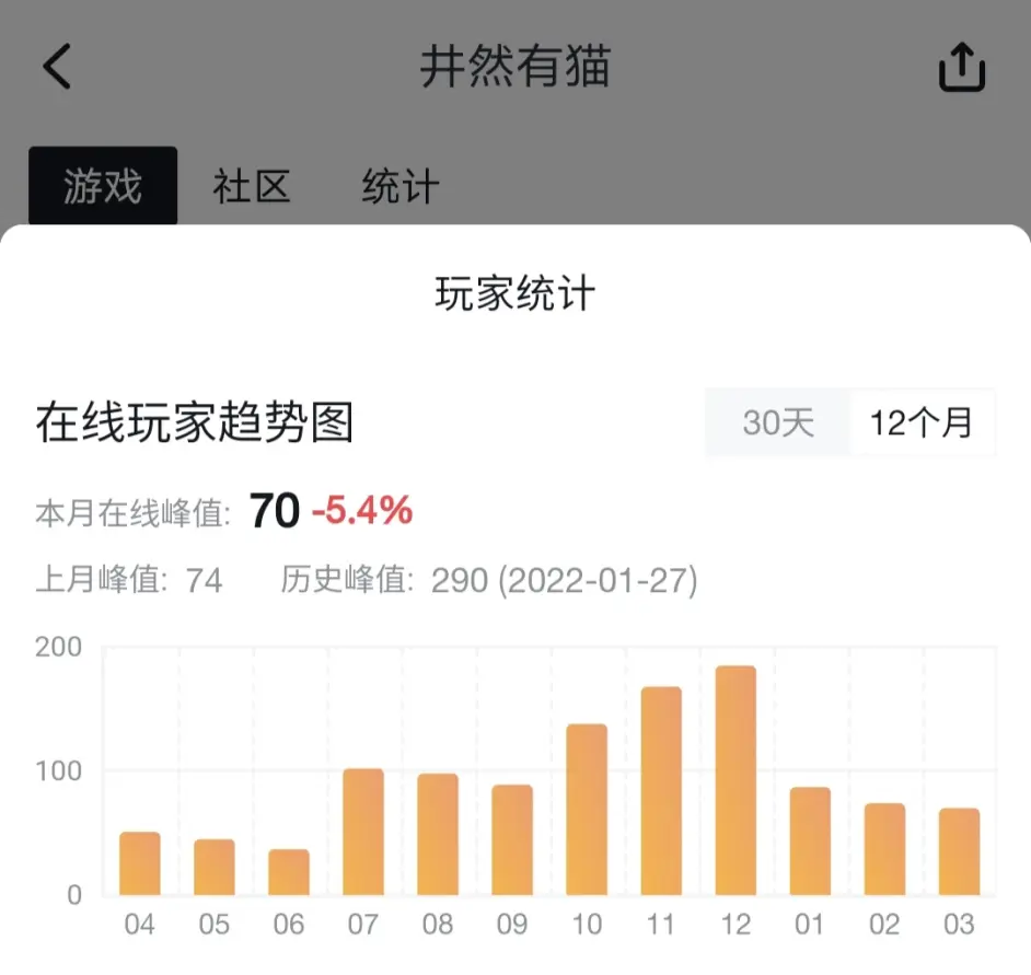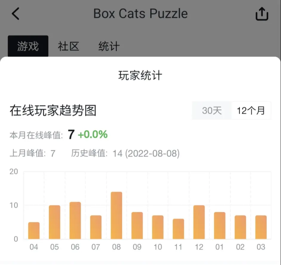 貓盒拼圖小黑盒資料小黑盒顯示的巔峰線上人數甚至不超過15個,對比隔壁井然有貓(Cats Organized Neatly)日均70+的線上簡直羨慕的要瘋掉了好吧TAT