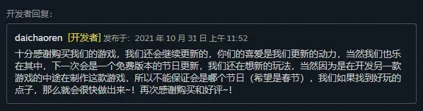 這款遊戲或許以後還會更新或者不會更新了?據我瞭解到關於這個獨立工作室的訊息非常少,遊戲也不怎麼在社交媒體宣傳,twitter上宣傳的也全是一些底邊小v。總之還是希望以後能玩到新的貓貓DLC,某個開發者微博:嚮往天空的風箏,策劃twitter:daichaoren,美工twitter:fokiki7