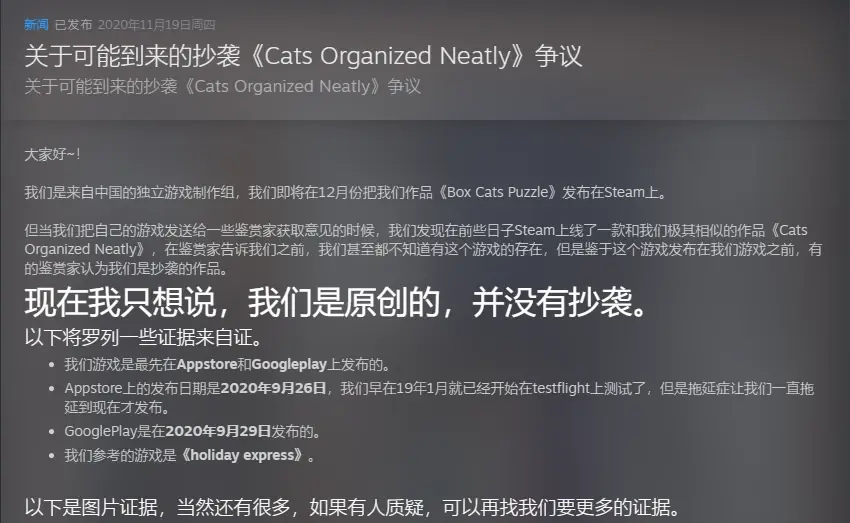 為避免玩家認為貓盒拼圖(2020.12.02)抄襲了井然有貓(2020.10.13),作者在遊戲釋出前就發表了宣告