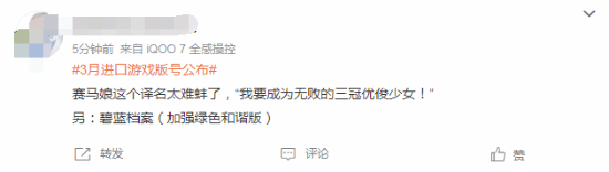 玩家吐槽最多的是漢化為《閃耀!優俊少女》的《賽馬娘》,以及漢化為《蔚藍檔案》的《碧藍檔案》。在不少玩家的心中,這兩款作品都屬於過審難但質量高的遊戲,能獲得版號讓人非常驚喜。
