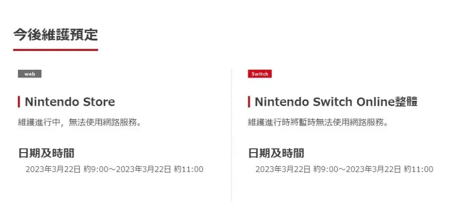 任天堂將於3月22日9:00-11:00期間,對網頁版Nintendo Store進行網路維護,維護期間無法瀏覽併購買遊戲。與此同時將對Nintendo Switch Online進行維護,期間無法使用相關服務。