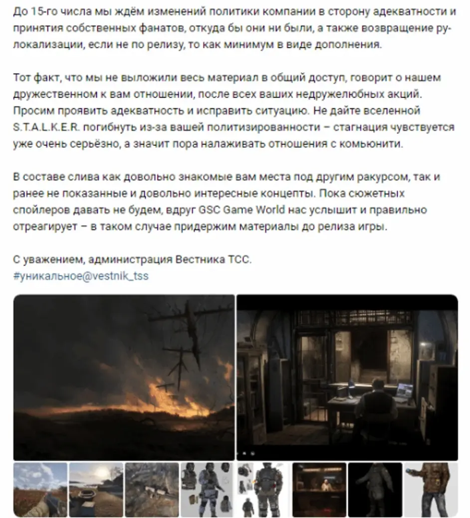 3月12日,有黑客組織在外網社群論壇發帖威脅《潛行者2:切爾諾貝利之心》開發商GSC Game World修改遊戲的部分內容,否則將公開近30GB的遊戲檔案資料。