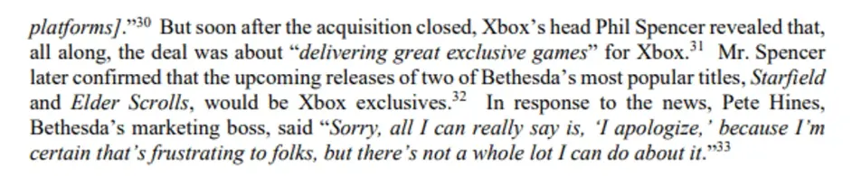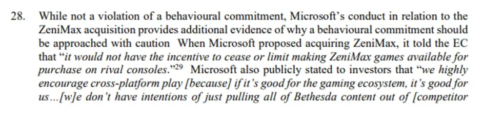 索尼指出,微軟在收購B社的母公司ZeniMax時也曾向監管機構表示,他們“沒有動機”讓ZeniMax的遊戲不再登陸競爭對手的平臺。然而收購完成後,斯賓塞則改口稱收購的目的一直是“為Xbox提供優秀的獨佔遊戲”,隨後確認《星空》和《上古卷軸6》都不登陸PS平臺。