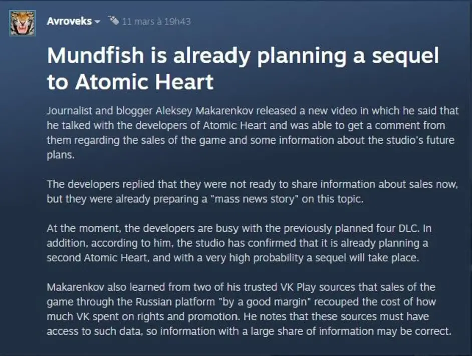 據俄羅斯記者Alexei Makarenkov訊息,Mundfish也已在計劃《原子之心》續作。
