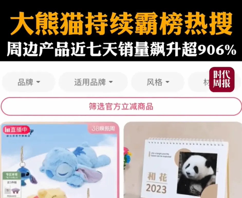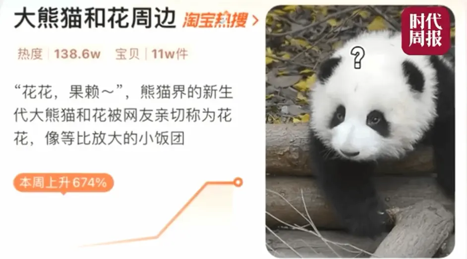 “現在我手機各個軟體的播放歷史記錄裡,除了花花的視訊,就沒有別的東西了。”一位熊貓愛好者告訴時代週報。“大熊貓和花周邊”一度衝上淘寶熱搜榜,“和花”周邊近七天銷量飆升超906%,印有“和花”圖案的手機殼、日曆、鑰匙扣等物品成為爆款。
