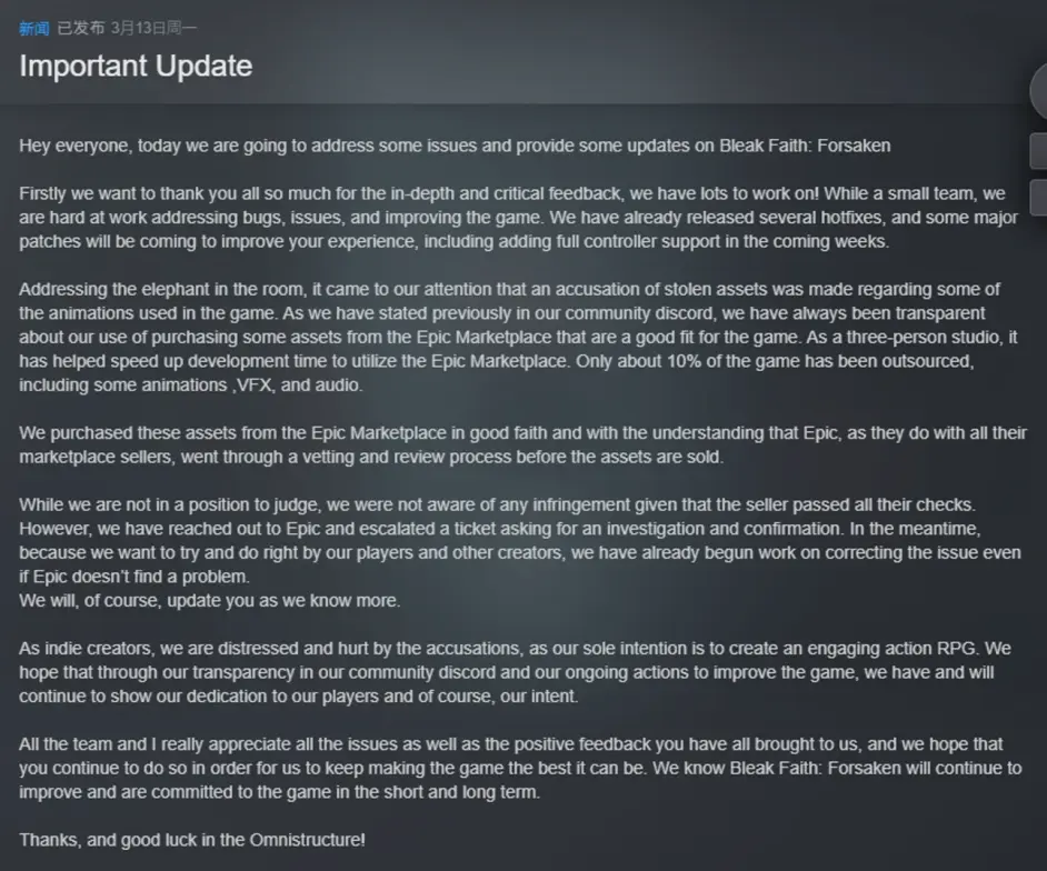 開發商表示,作為一個三人遊戲工作室,他們購買了Epic商店的素材來加快開發時間。遊戲只有大約10%的內容為外包,包括一些動畫、VFX和音訊等。而被網友指出有問題的這些是從Epic買來的。