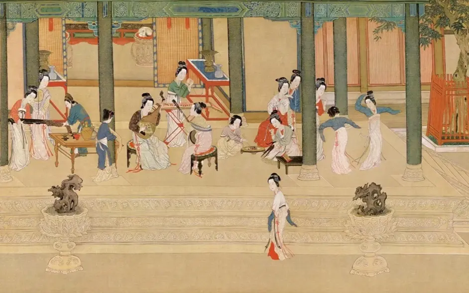 《漢宮春曉圖》以人物長卷畫,生動地再現了漢代宮女的生活情景。其用筆清勁而賦色妍雅,林木、奇石與華麗的宮闕穿插掩映,鋪陳出宛如仙境般的瑰麗景象,極勾描渲敷之能事,體現了作者積極向上、熱愛生活的人文思想,亦表達了他對宮廷浮華美好生活的讚美。