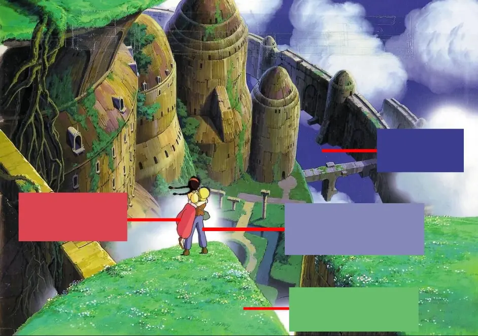 一方面吉卜力用色經常不是用純度非常高的顏色,相反,動畫會摻合一些高階灰的用色,以下圖宮崎駿名作《天空之城》的場景圖為例,這又是一張帶藍天綠草的畫面。