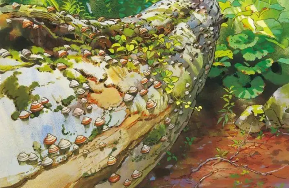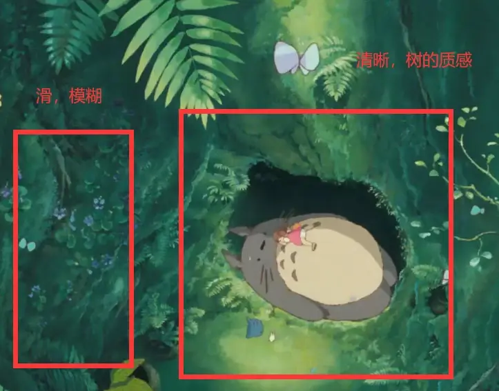 而到了龍貓睡覺兩側的岩石內壁部位,則模糊了一些筆觸,並用一些黏糊的筆觸來突出石壁滑溜的質感,而到了中心點龍漫睡覺的樹洞位置,則又重點雕琢木頭的質感,讓畫面維持在清晰到模糊到清晰的變化過程。因而全張圖都是綠色的場景裡,也能分出明顯的層次感。