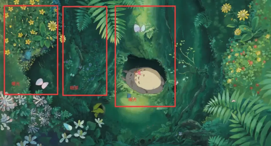 所以吉卜力的色彩總能穩定的色彩架構上印襯出各種複雜的細節,這都是靠兩種色彩塑造的結合而得到的效果。在此基礎上,取色方面,吉卜力也有一套自己的邏輯。